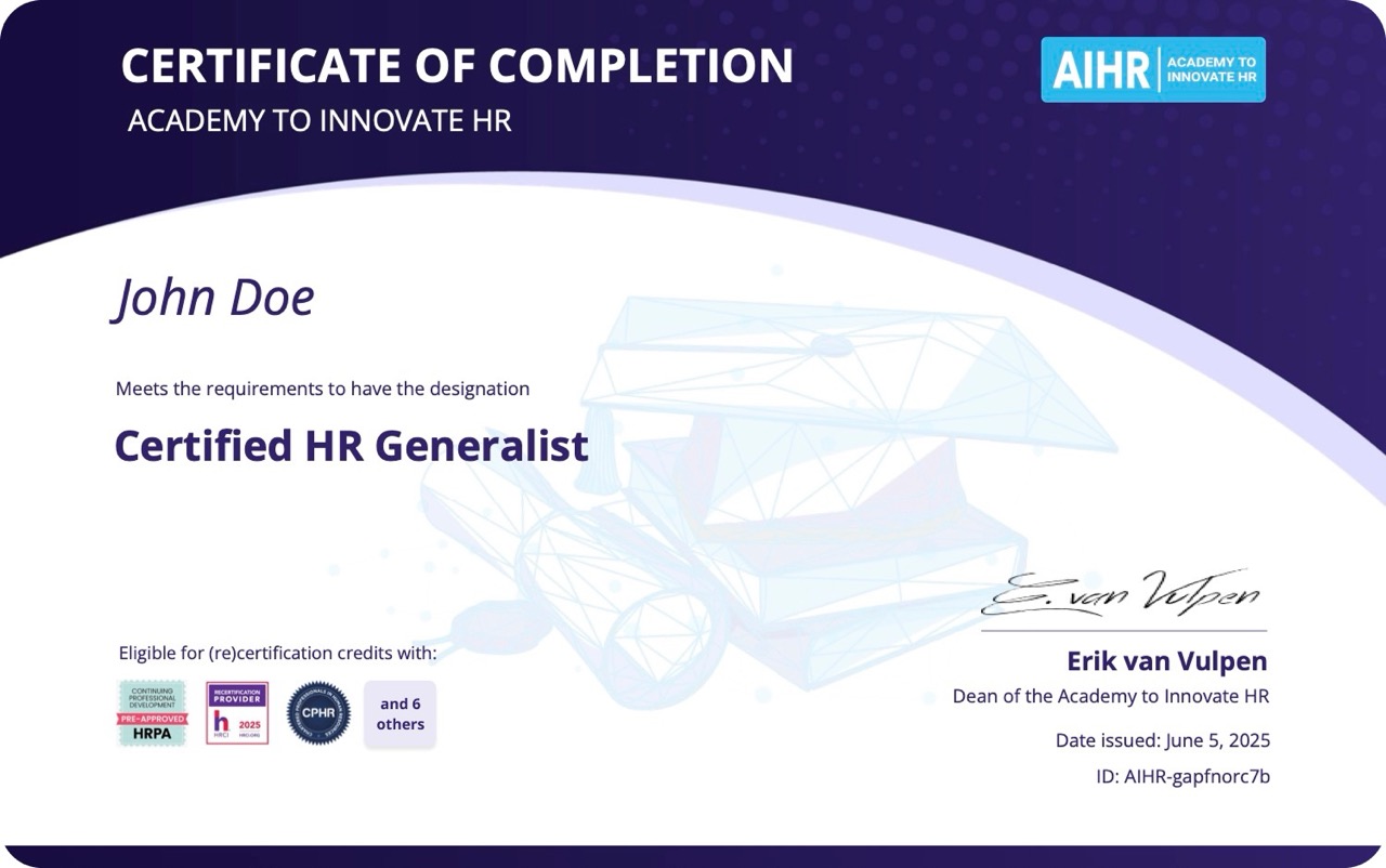 AIHR is accredited by world’s leading HR associations, allowing you to earn personal learning credits. Upon completion you will receive: